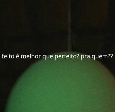 “A pressa é inimiga da perfeição” - essa, sim, é uma frase verdadeira. Nem sempre o feito vai ser melhor que o perfeito. O feito as vezes vai fazer você se achar feia, incopetente e uma péssima profissional. O feito pode te fazer duvidar de você mesma e ainda estampar na sua cara: “haha você não é tão boa assim”. O feito vai fazer você se sentir um lixinho, mesmo que na maioria das vezes você se ache fodona.